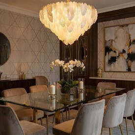 Металлический каркас золотистого оттенка переливается в лучах света, вступая в гармоничный союз с листьями из матового и прозрачного стекла и керамики. Металлические листья-подвески отлиты по ювелирной технологии, что подчёркивает изысканность и чёткость флористического рисунка. В изделии используется 5 лампочек с цоколем G9, тип крепления светильника — планка.