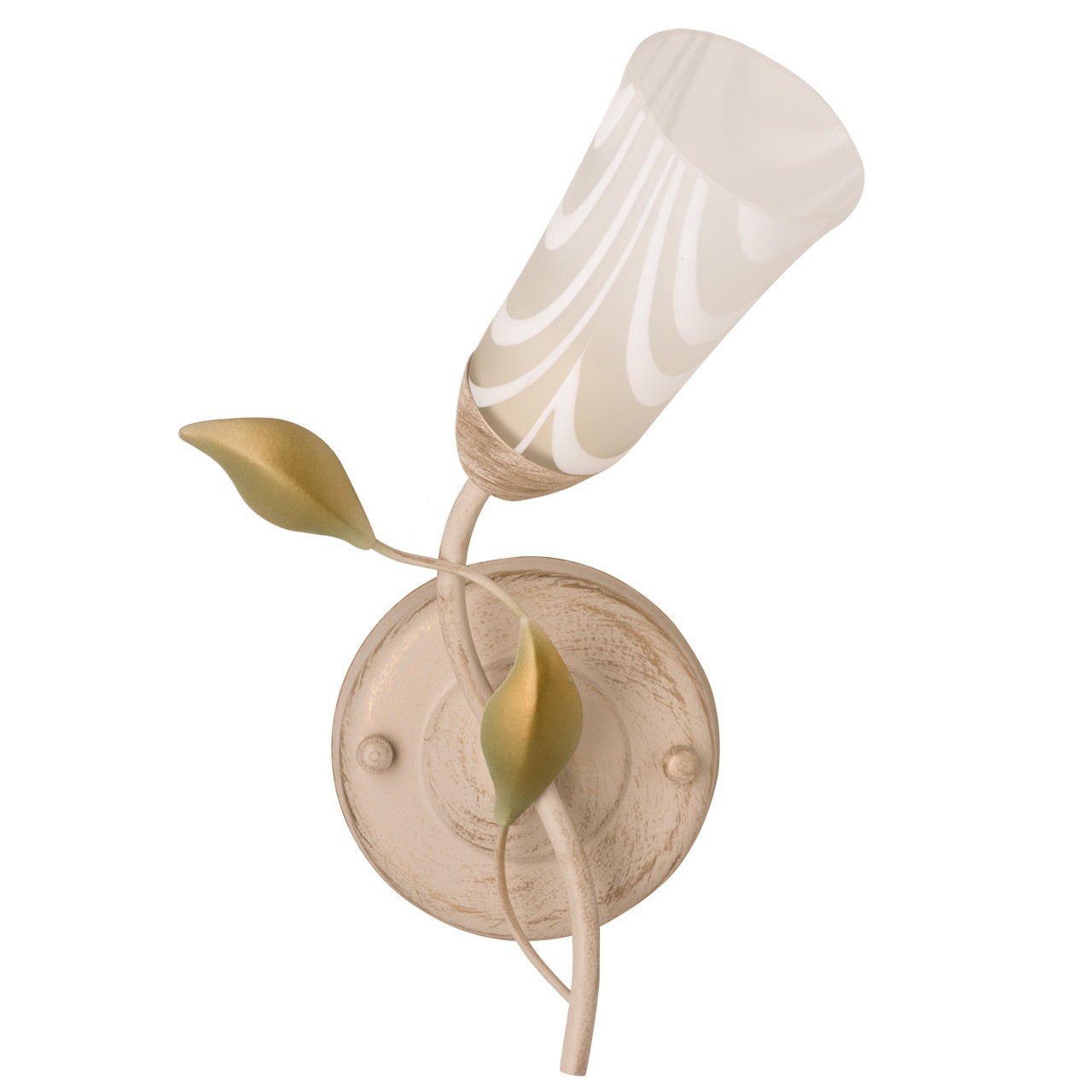 Основание: металл, окрашивание по технологии хай-лайт, основной цвет - белый, декоративный слой цвета золота. Рожок выполнен по технологии проката на роликовом станке. Плафон: стекло отлитое в форму, матирование, ручное окрашивание по поверхности.Декор: растительные элементы из металла, окрашивание в салатовый цвет.