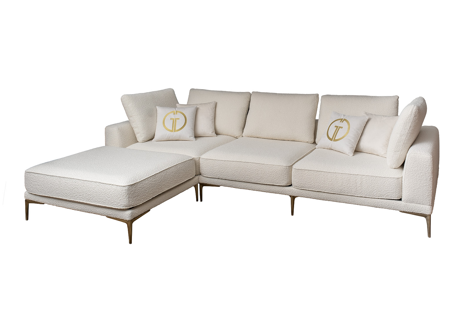 Комплект мебели №53 модульный Диван Тесоро(Tesoro) (левый угол). В состав комплекта входит: модуль угловой левый DR-1шт, модуль угловой правый KL+P- 1шт. Комплект выполнен в ткани из коллекции Garda Decor- букле Orso-Ecru. В состав комплекта входят декоративные подушки: 45*45см в ткани Атмосфера(Atmosphera)010-2шт, 45*45см в ткани Атмосфера(Atmosphera)000-2шт с вышивкой эмблема в цвет золото. Металлические опоры 18см, цвет бронза. Габариты комплекта: ширина- 3100мм, глубина-2000мм, высота- 900мм. Глубина сиденья- 750мм, высота посадочного места- 440мм.