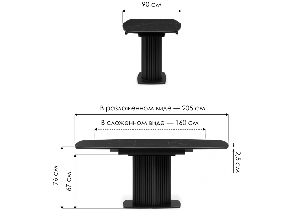 Материал каркаса - металл; Материал столешницы - Керамика; Ширина - 90; Высота - 76; Длина стола в разложенном виде - 205; Длина - 160;