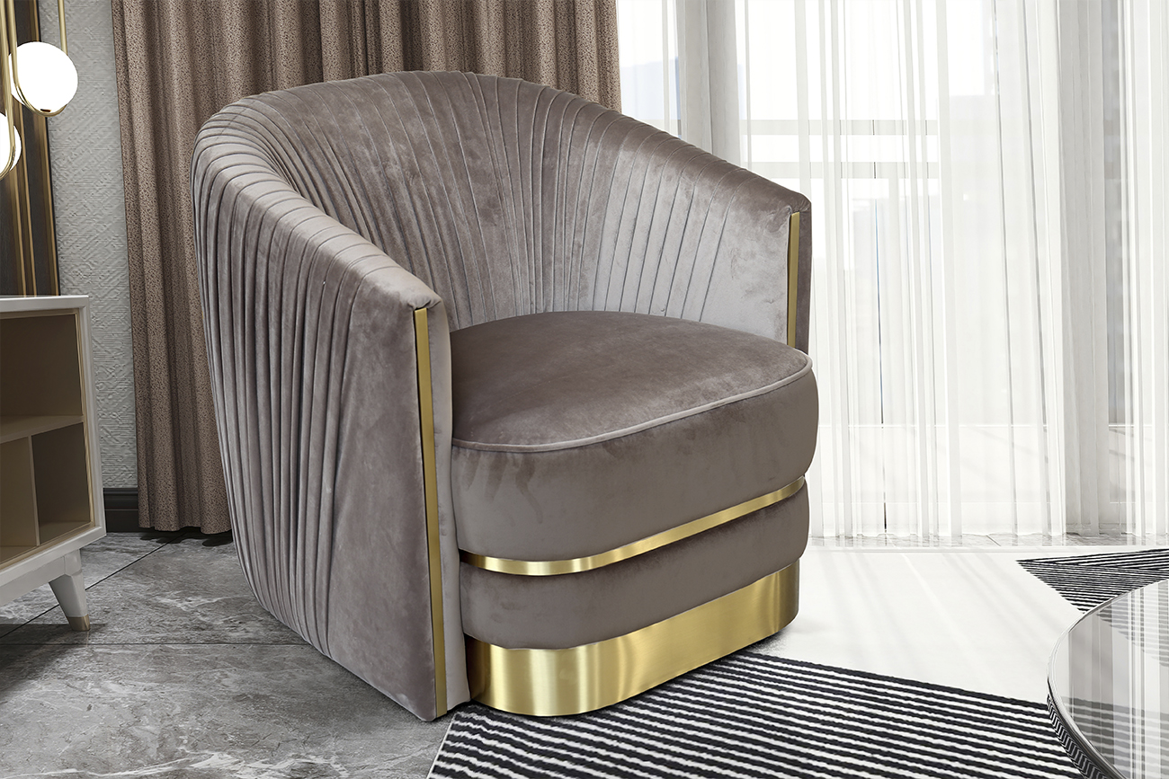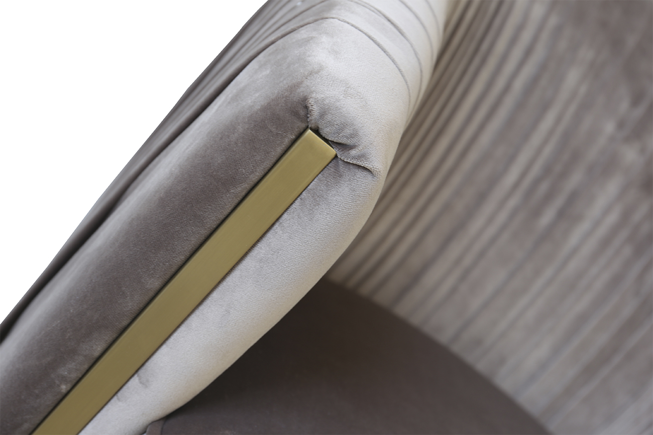 Велюровое кресло выполнено в изысканном авторском стиле. Спинку модели украшает элегантная драпировка, а корпус – позолоченные металлические вставки. Серо-коричневая обивка сшита из качественной, изящной и приятной на ощупь ткани. Модель отличается сочетанием красоты и комфорта. Можно купить кресло в гостиную, банкетный зал или спальню – форма и стиль мебели располагает к использованию в различных современных обстановках.