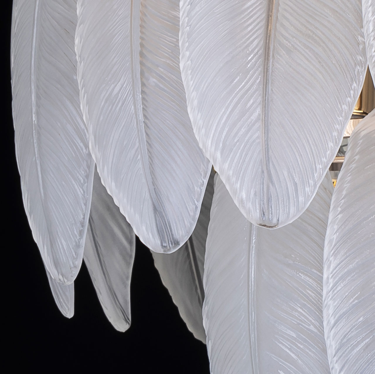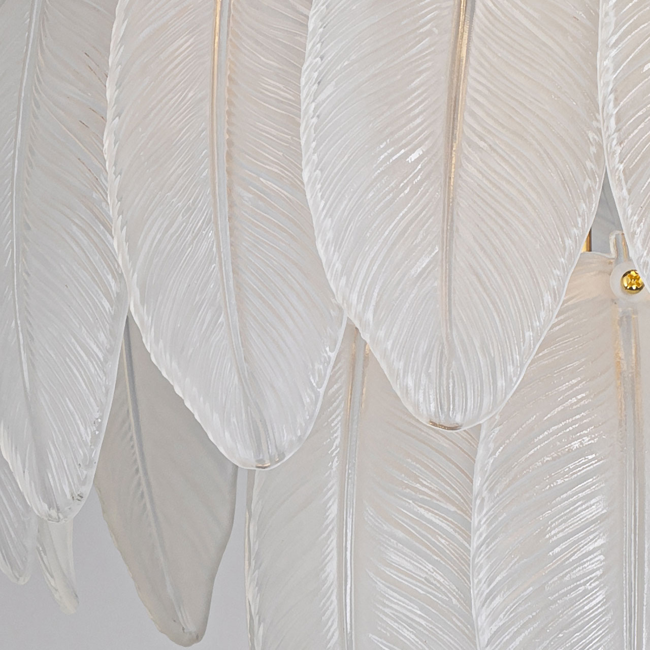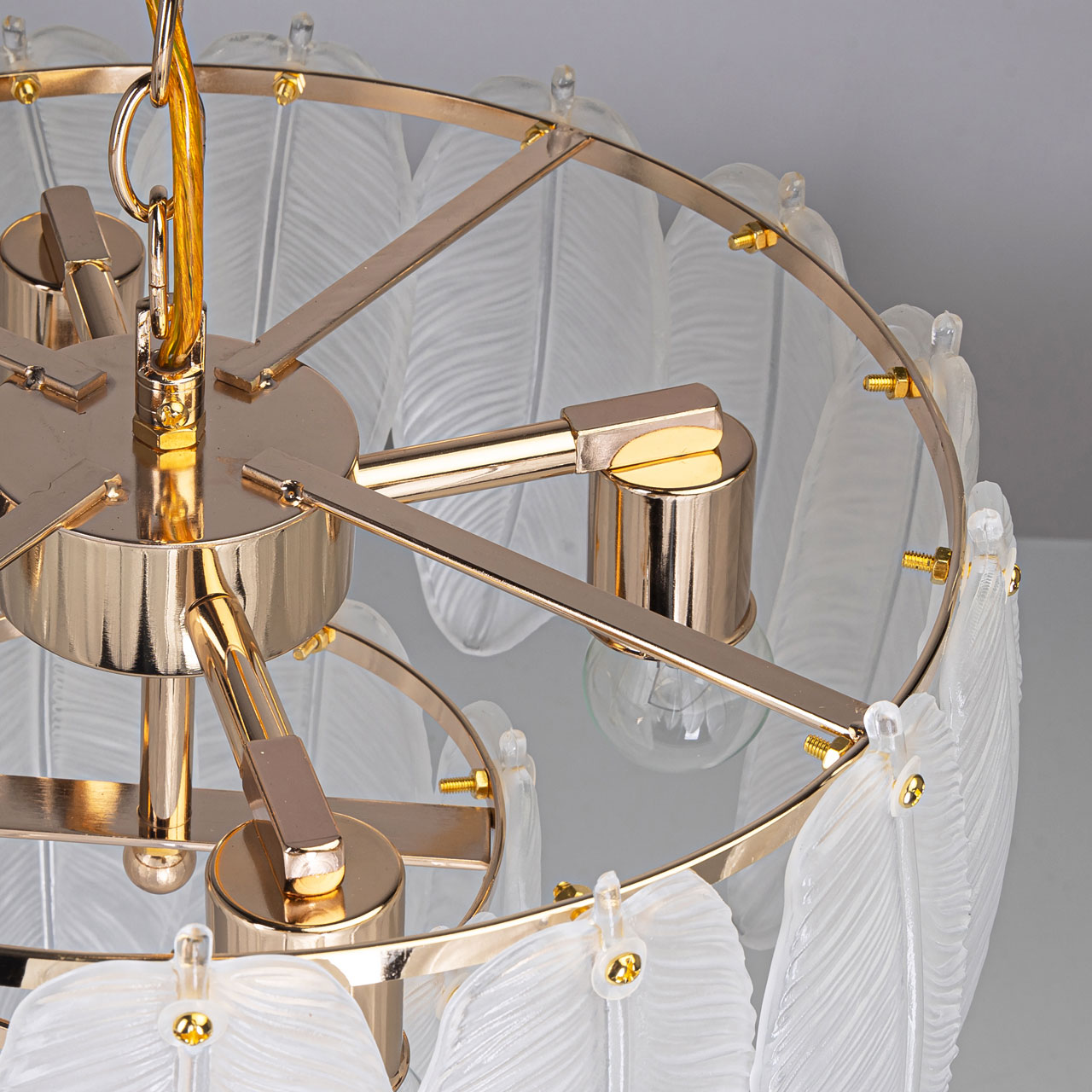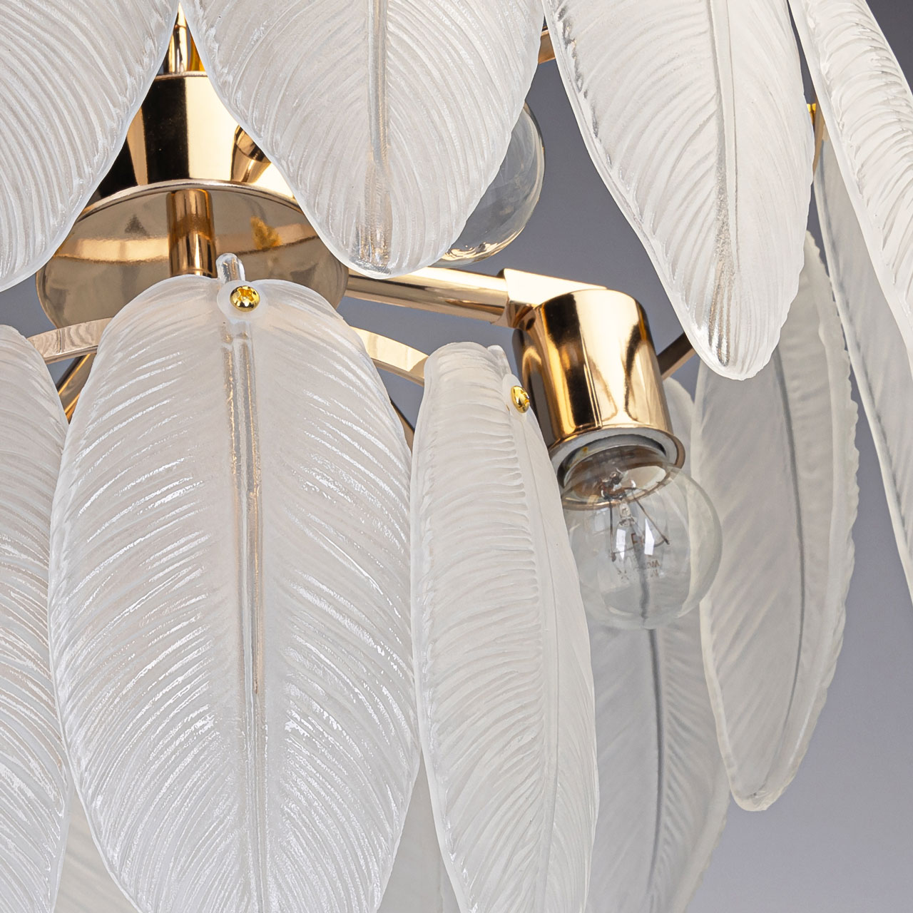 Металлическое основание светильника гальванизировано в цвет золота. Люстра декорирована матированными стеклянными элементами в форме листьев.