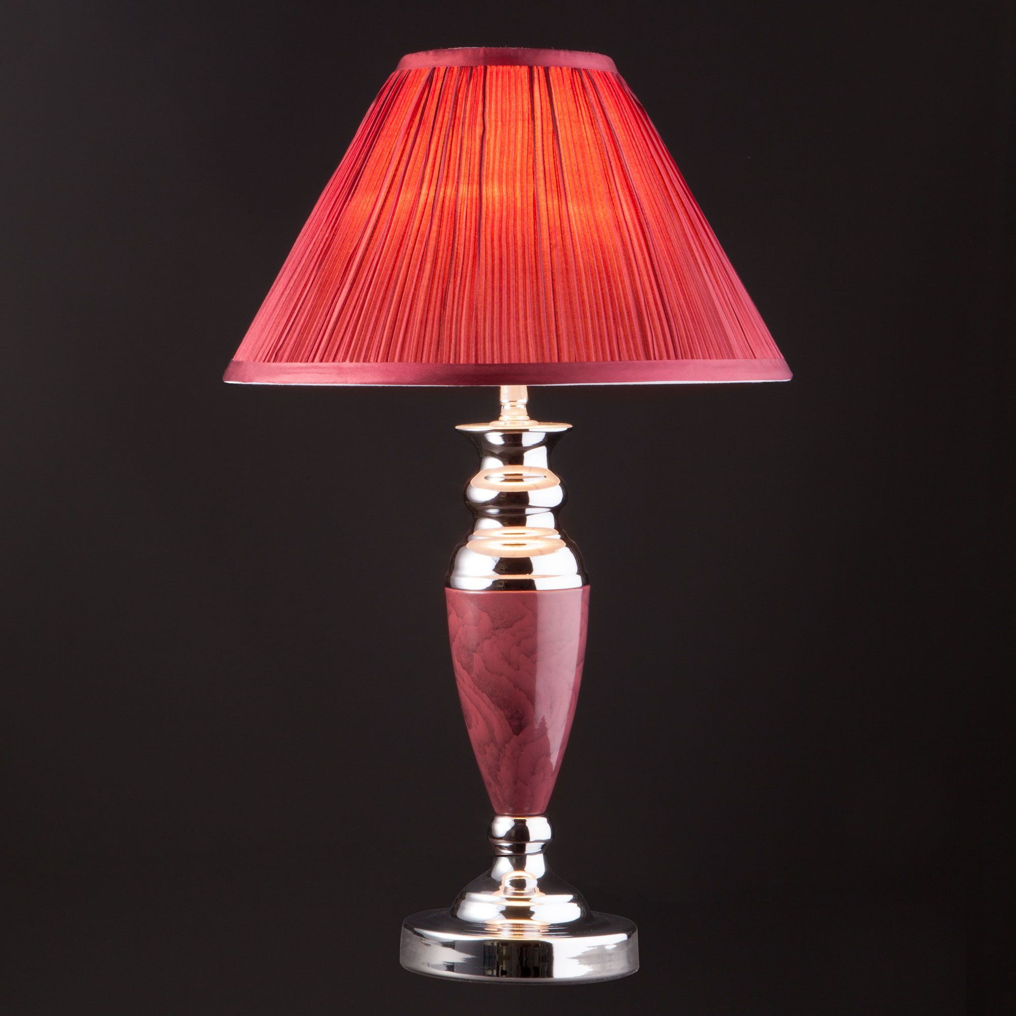 Благодаря бордовому тканевому абажуру настольная лампа создает мягкое рассеянное свечение, подходящее для комфортного чтения книг в вечернее время. Прочный металлический корпус светильника устойчив к механическим воздействиям, а защитное покрытие обеспечивает надежную электроизоляцию.