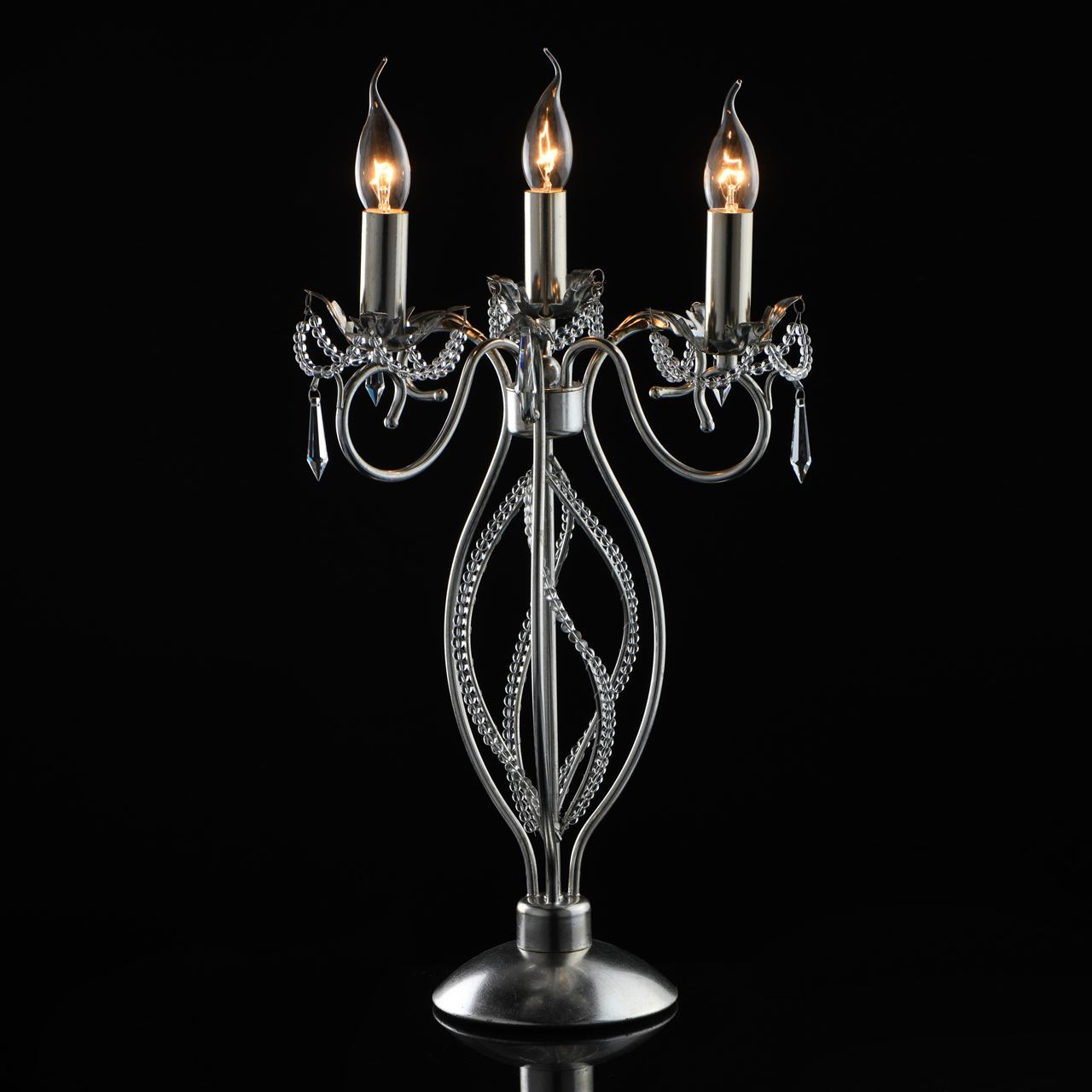 Основание светильника выполнено из металла и покрыто сусальным серебром. Светильник декорирован бусами из прозрачного хрусталя и хрустальными подвесками формы капля.