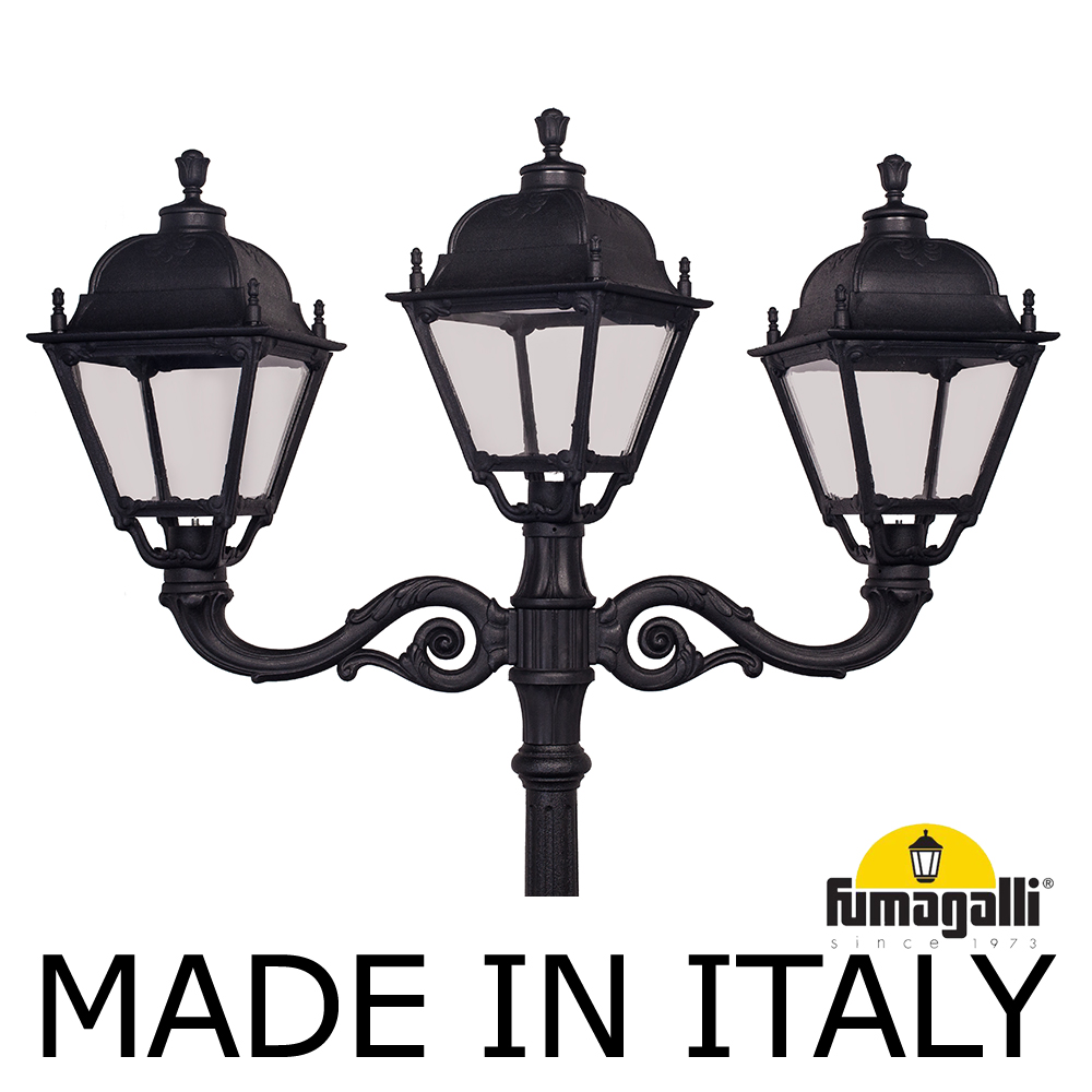 Парковый фонарь FUMAGALLI большого размера серии SIMON, модель TABOR ADAM/SIMON 2L+1. Парковый фонарь с 2 светильниками большого размера, на консолях ADAM большого размера, плюс 1 венчающий светильник, установленные на классическом столбе TABOR высотой 3,0 м (+высота фонарей на кронштейнах). Изготовлены в Италии, по уникальным технологиям "FUMATECH" из современного композитного полимера RESIN. Этот материал в 5 раз прочнее металла, не ржавеет, не окисляется, не выгорает на солнце, его не нужно красить. Все светильники пыле-влаго защищены по стандарту IP55 (Пылезащищенные, защита от водяных струй с любого направления). Рассеиватель выполнен из антивандального, не мутнеющего и не горючего PMMA (ПолиМетилМетаАкрилат). Срок службы светильника - не менее 20 лет. Температура использования от -60 до +90. В серии SIMON есть садовые фонари в настенном (OFIR/SIMON, MIRRA/SIMON) подвесном (SICHEM/SIMON) и наземном исполнении (IAFAET.R/SIMON, ALOE.R/SIMON, ARTU/SIMON, GIGI/SIMON, RICU/SIMON, NEBO/OFIR/SIMON 1L, NEBO/OFIR/SIMON 2L, TABOR/ADAM/SIMON 3L) со столбами разной высоты, с разным количеством и конфигурацией голов. Консоли настенных фонарей и кронштейны светильников на столбах освещения могут устанавливаться в положение вверх и вниз. Столбы выше 150 см имеют в основе мощную стальную трубу с двойной оцинковкой. При заказе требуется выбрать цвет корпуса, цвет плафона и тип патрона (Е-27 или LED GX-53). Возможен светодиодный вариант. По стилю и дизайну серия уличных светильников SIMON похожа на светильники среднего размера серии CEFA. По размеру относится к большим парковым светильникам как серия NOEMI и GLOBE 400.