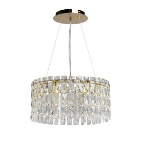 Металлическое основание подвесной люстры гальванизировано в цвет латуни. Люстра декорирована прозрачным хрусталем.