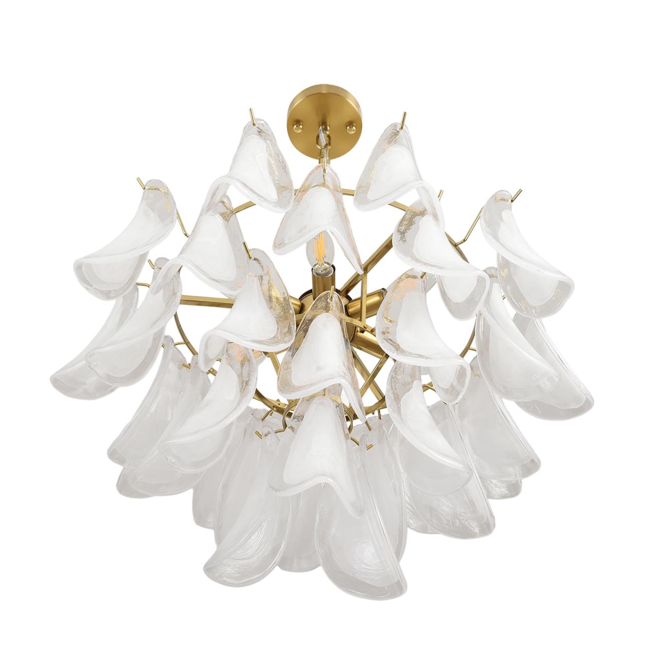 Серия PLUME станет центральным элементом любого интерьера, привлекая внимание своим изысканным дизайном. Она выполнена из высококачественного стекла ручной обработки: центральная часть белая, по краям прозрачный ободок. Люстра состоит из множества рожков разной длины, каждый из которых украшен стеклянными элементами. Эти элементы переливаются в свете, создавая завораживающую игру света и тени. Золотистая арматура, поддерживающая рожки, добавляет роскоши и создает яркий контраст. Эта люстра идеально подойдет для украшения гостиной, столовой или спальни в классическом стиле. Она не только обеспечивает функциональное освещение, но и добавляет в интерьер нотку элегантности и утонченности.