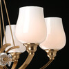 Основание выполнено из комбинации сплавов металлов и гальванизировано в цвет латуни. Рожки выполнены из сплава алюминия по технологии художественного литья, декоративные подвесы выполнены из металла по технологии твист. Стеклянные плафоны выдуваются в форму вручную и окрашены в белый цвет изнутри. Корпус светильника декорирован стеклянными розетками, отлитыми в сложную форму.