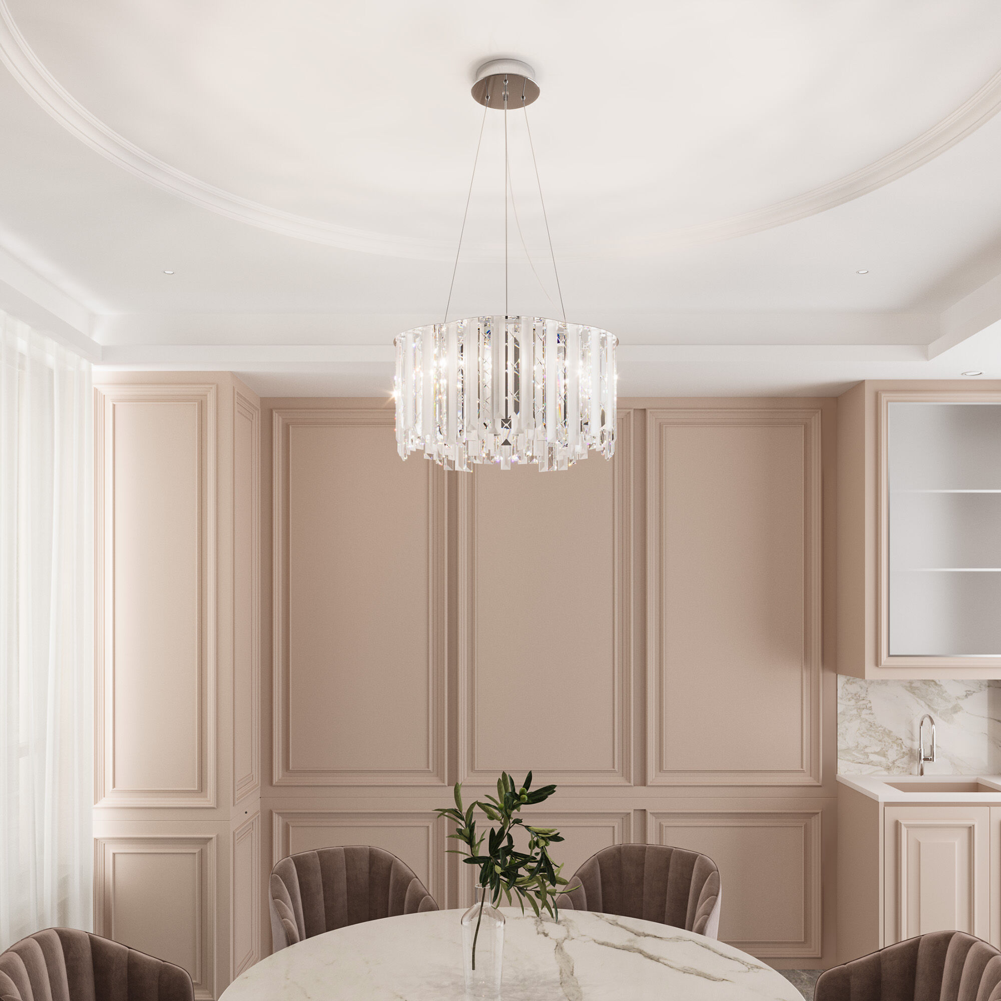 Декоративные хрустальные элементы переливаются на свету искристыми завораживающими бликами благодаря лампам с цоколем E14. В производстве подвесной люстры использовали хрусталь и высококачественный металл с надежным защитным покрытием.