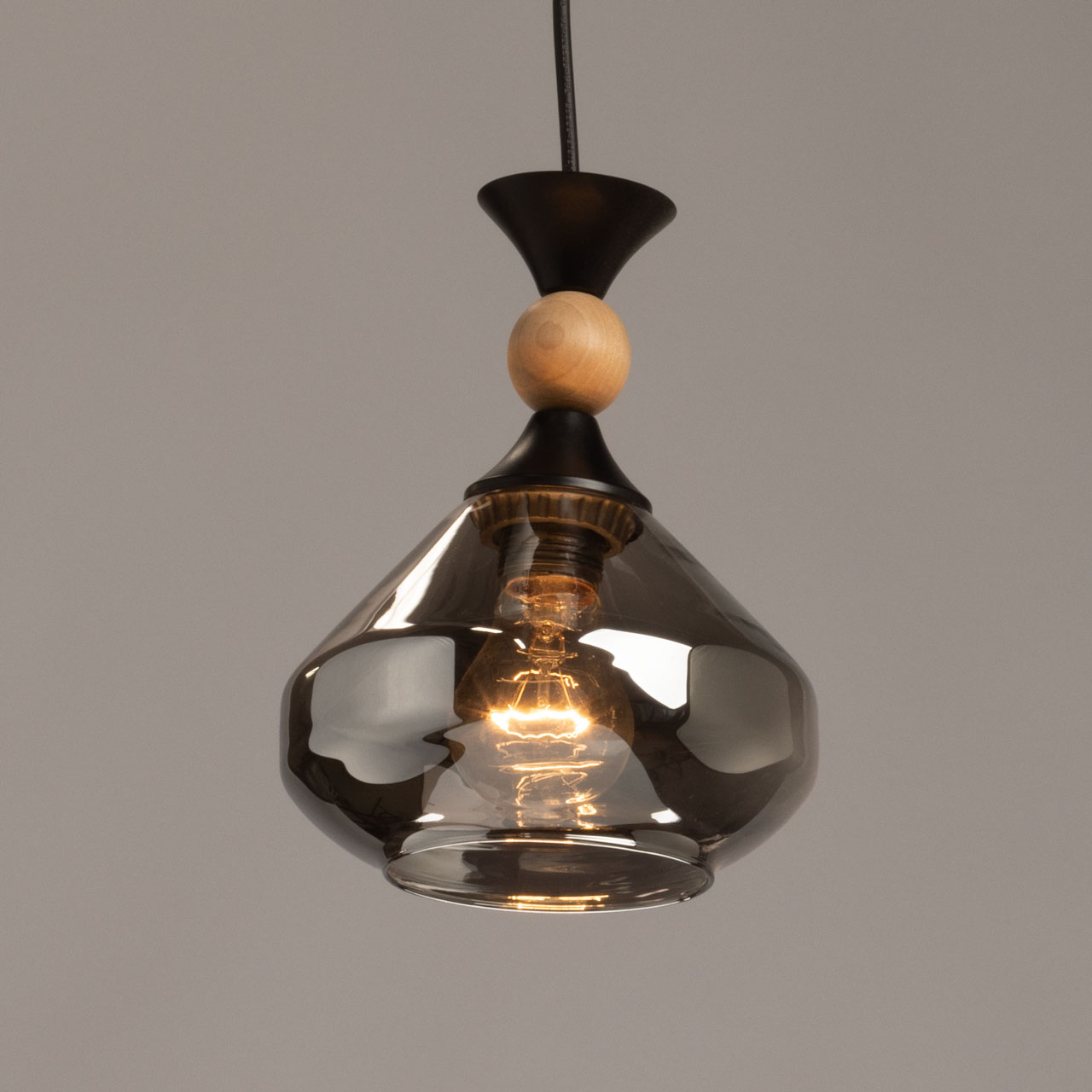 Металлическое основание светильника окрашено в черный цвет. Стеклянный плафон отлит в сложную форму и гальванизирован в дымчатый цвет. Декоративный элемент на подвесе выполнен из металла с имитацией под натуральное деревао.