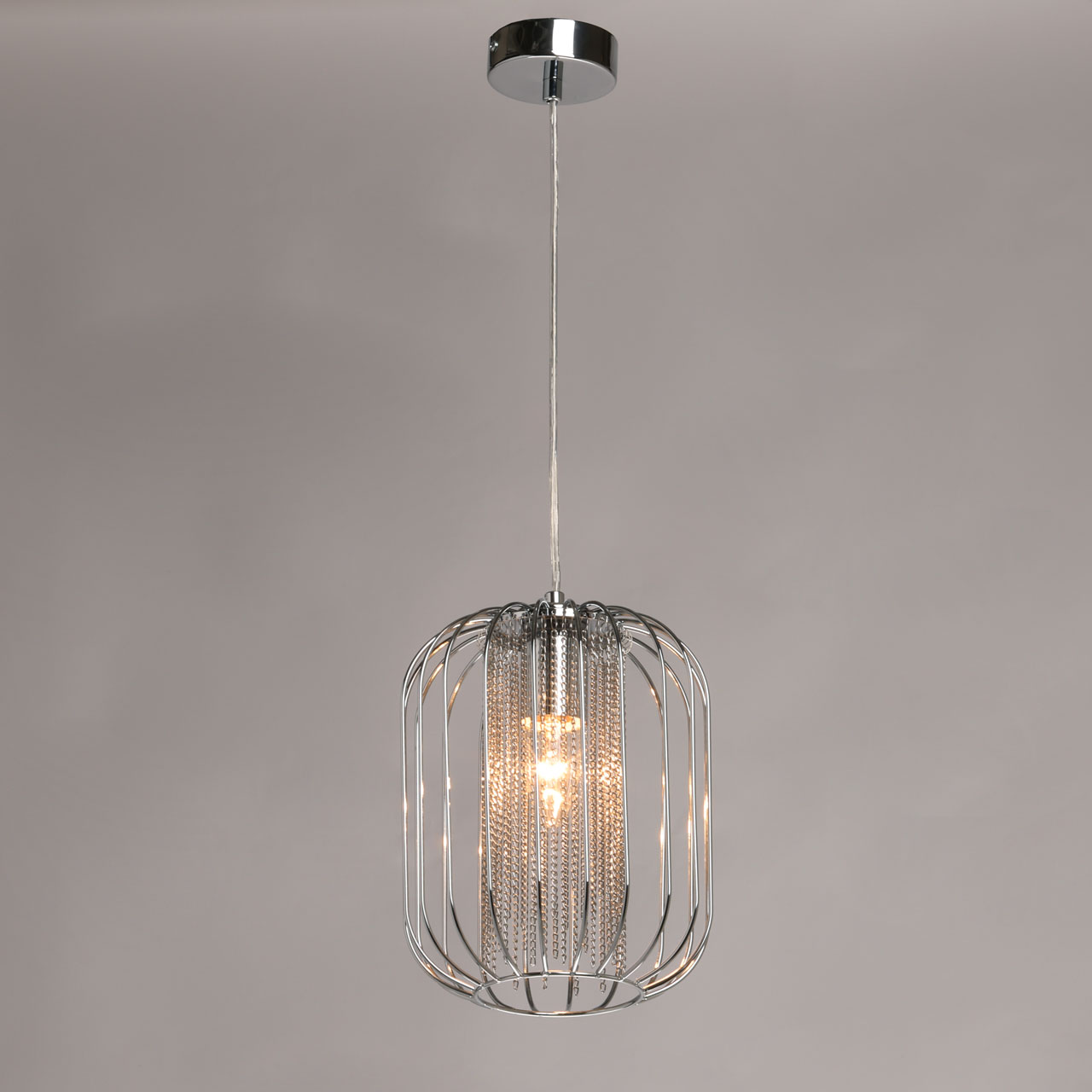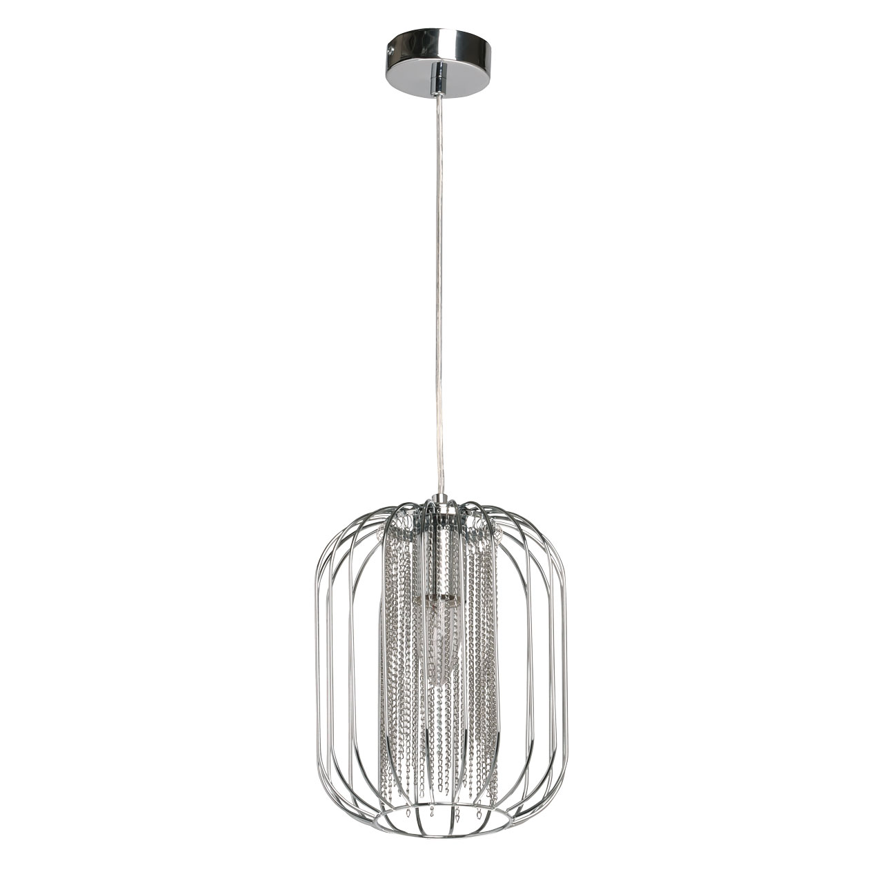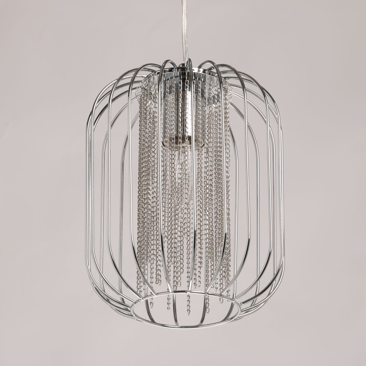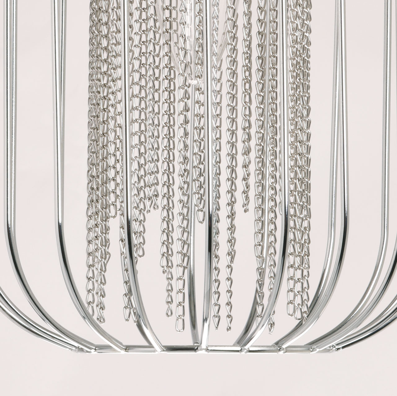 Металлическое основание подвеса гальванизировано в цвет хрома. Подвес декорирован цепочками, гальванизированными в цвет основания.
