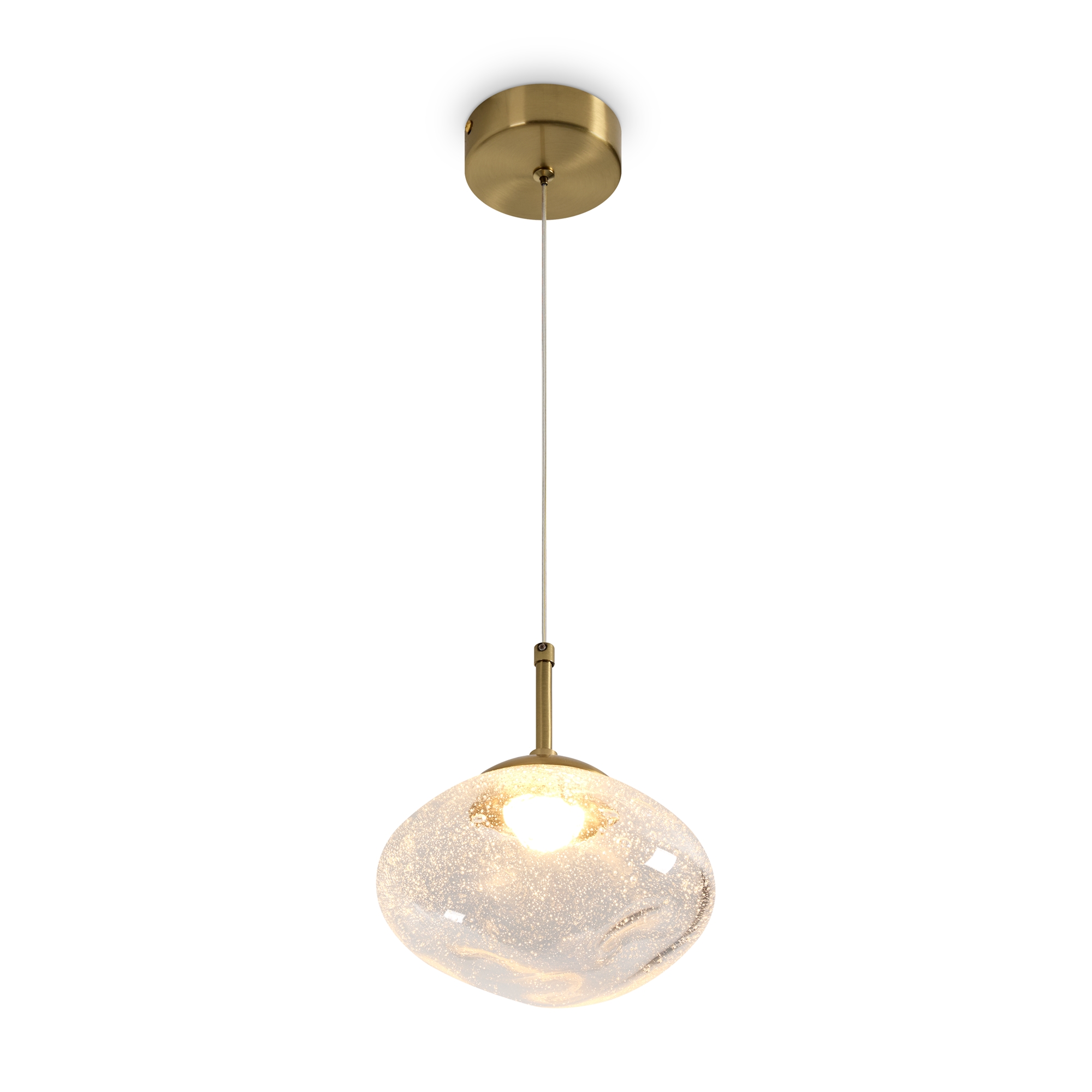 Арматура — металл. Стеклянные плафоны с пузырьками в трёх цветах: дымчатый, прозрачный, янтарный. Интегрированный LED источник света 3000К, Ra 80, угол 180°. Высота регулируется.