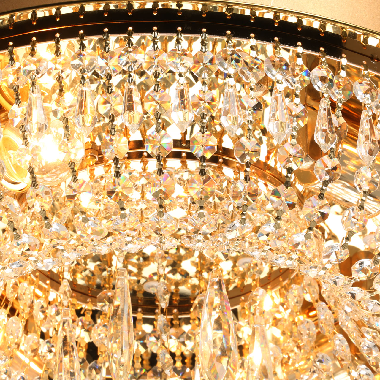 Металлическое основание гальванизировано в цвет французского золота с последующим матированием. Потолочная чаша закрыта листом нержавеющей стали, отполированной до зеркального блеска и гальванизированной в цвет основания. Светильник декорирован прозрачным хрусталем разной формы.