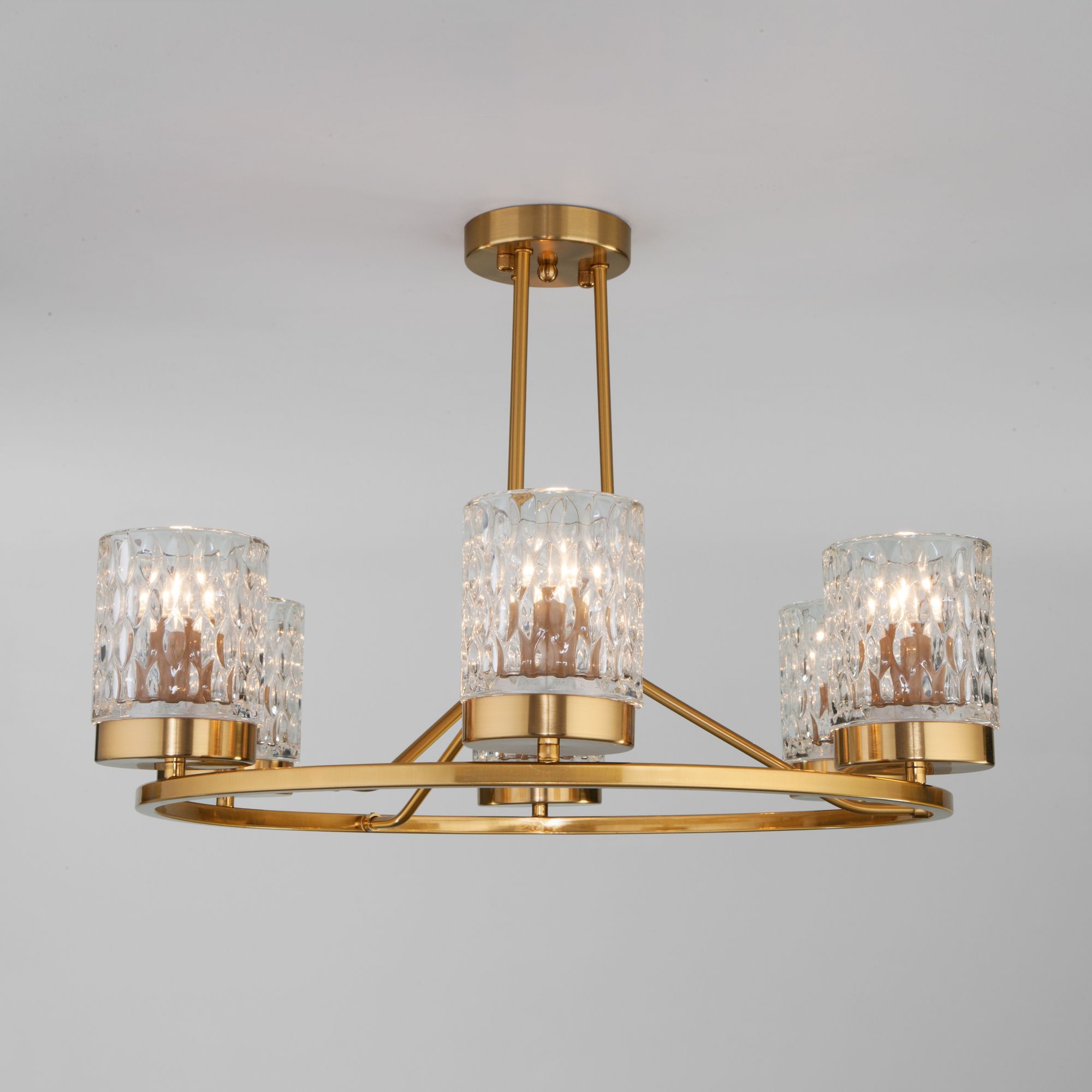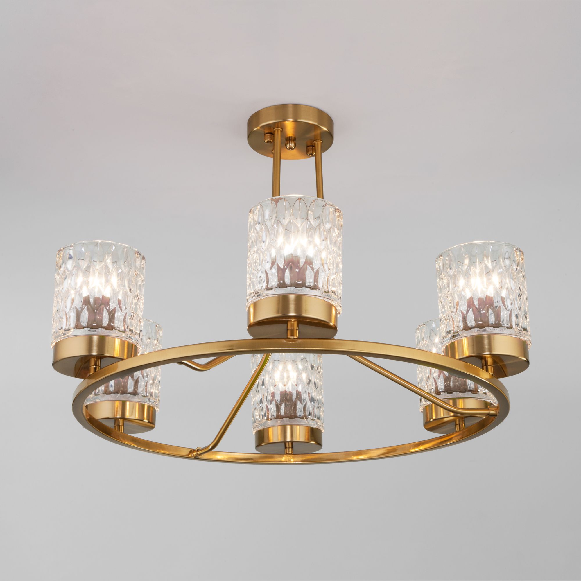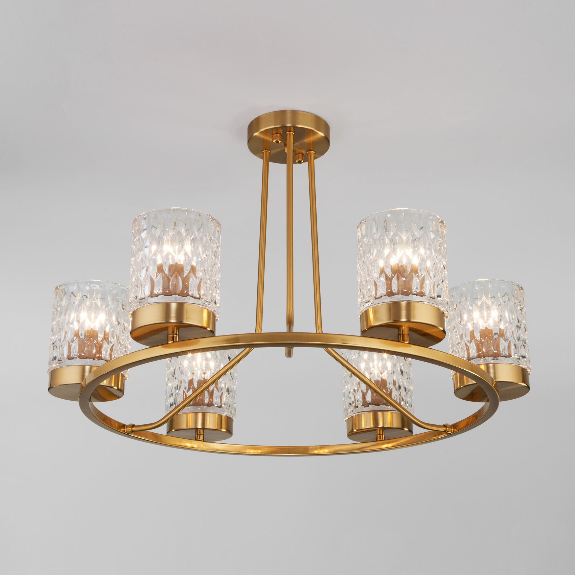 Организовать качественное освещение вам поможет эффектная потолочная люстра со стеклянными плафонами в цвете латунь. Простые эргономичные формы и умеренные тона станут прекрасным дополнением для вашего помещения.