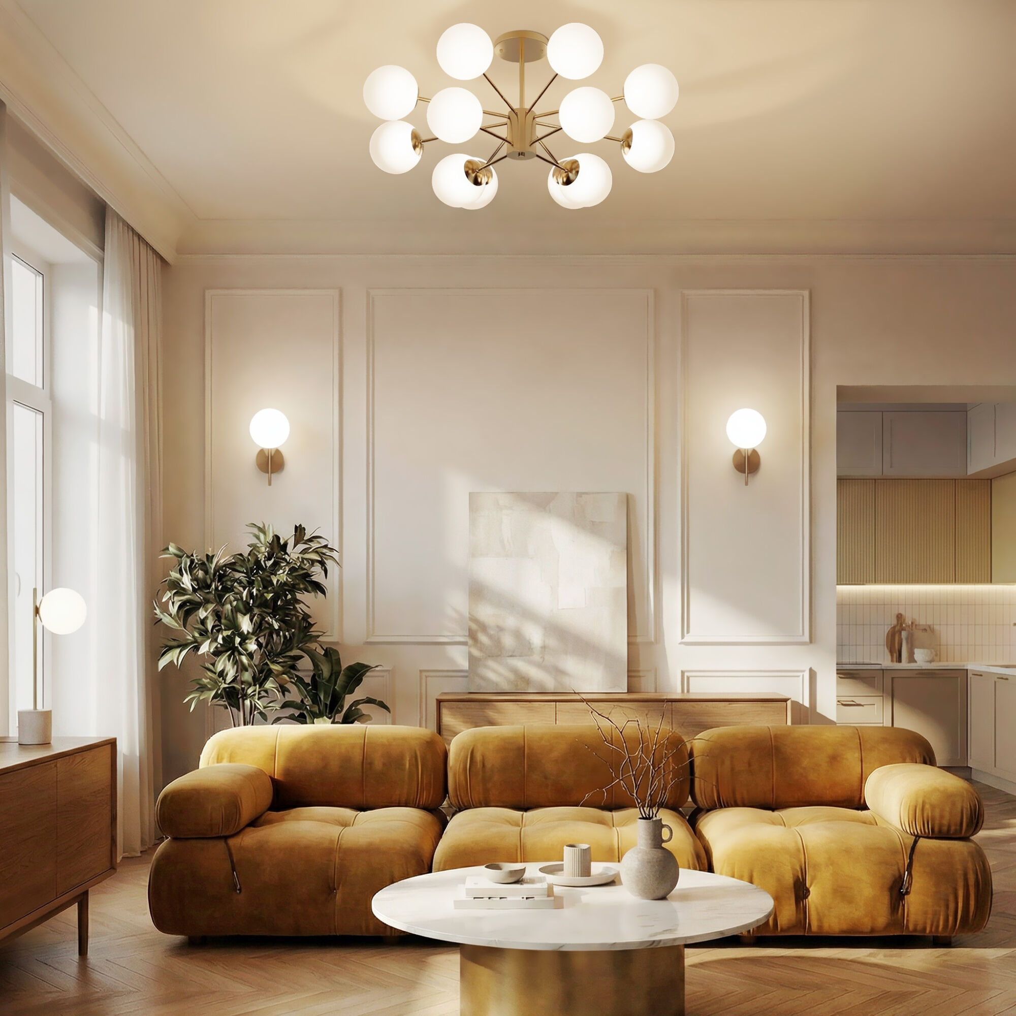 Потолочная люстра со стеклянными плафонами из коллекции Adaline преобразит пространство и создаст в нем приятную атмосферу. Матовые плафоны, изготовленные из жаропрочного стекла, излучают мягкий, рассеянный свет.