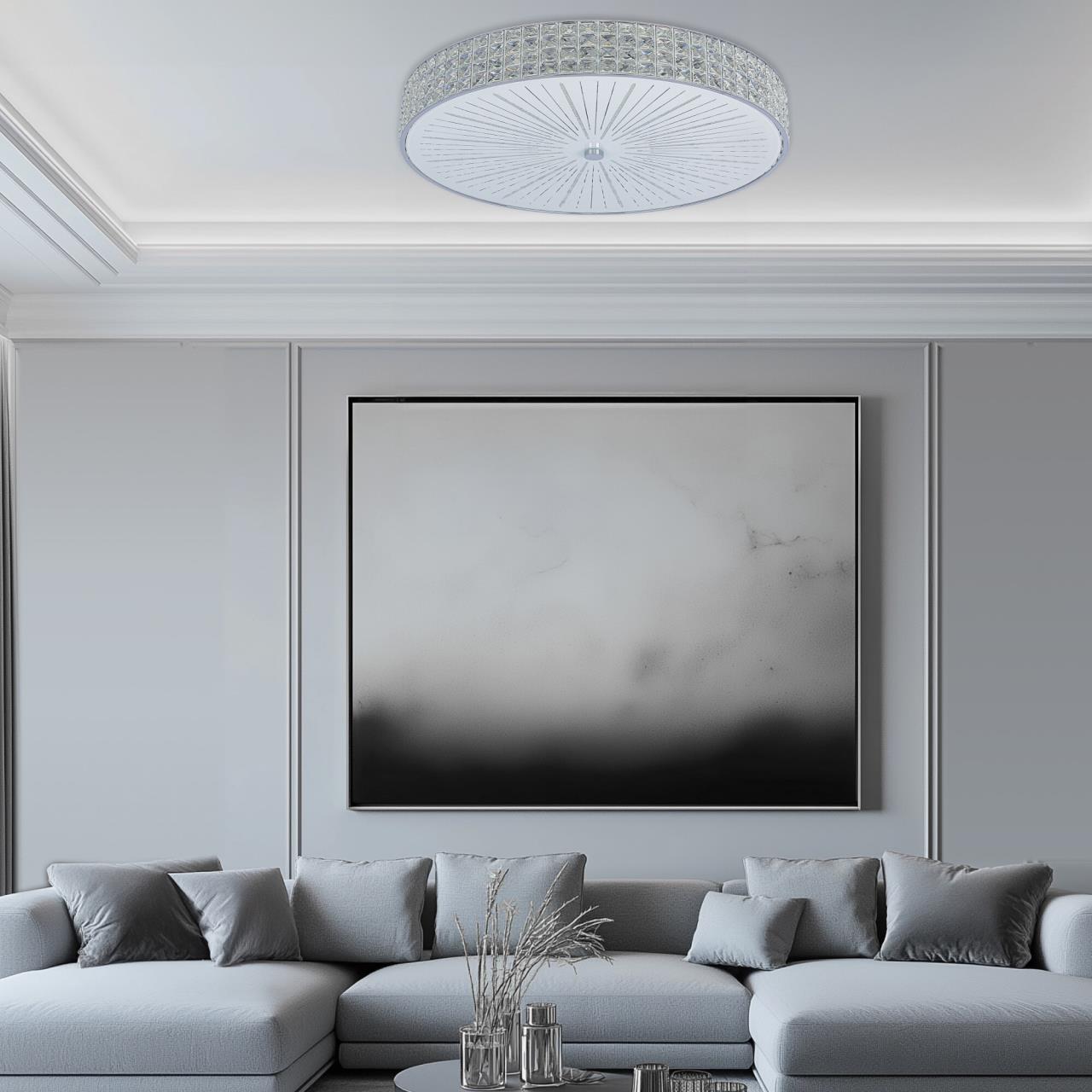 В изделии установлены яркие светодиоды основного света и цветной RGB подсветки. С помощью пульта доступно: плавная регулировка яркости от 10 до 100%, управление цветовой температурой от 3000К до 5500К позволяет настроить любые оттенки теплого, нейтрального или холодного света. Цветная RGB подсветка имеет различные режимы работы. Есть функция отсроченного выключения, 4 настраиваемых режима памяти, которыми также можно управлять настенным выключателем. Пульт ДУ в комплекте, тип батареек ААА (батарейки в комплект не входят, приобретаются отдельно). Подходит для всех типов потолков, в том числе натяжных. Тип крепления – планка. Мощность изделия 105Вт, световой поток 8400Лм. Свет безопасный для глаз, без мерцания и пульсаций.