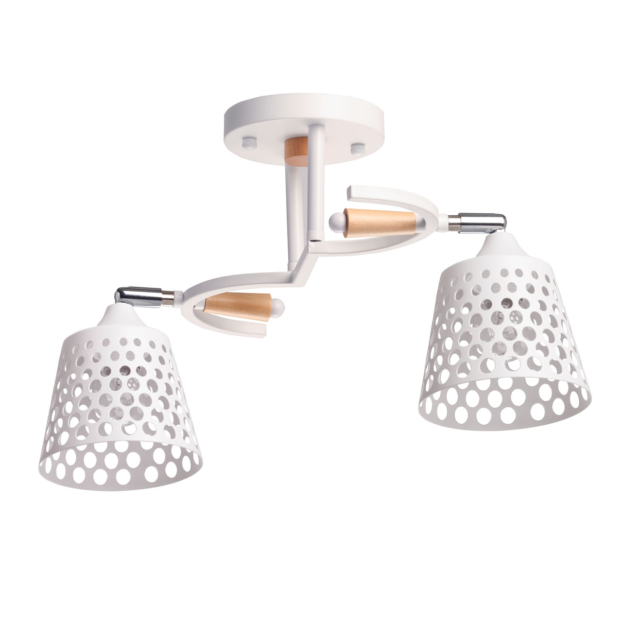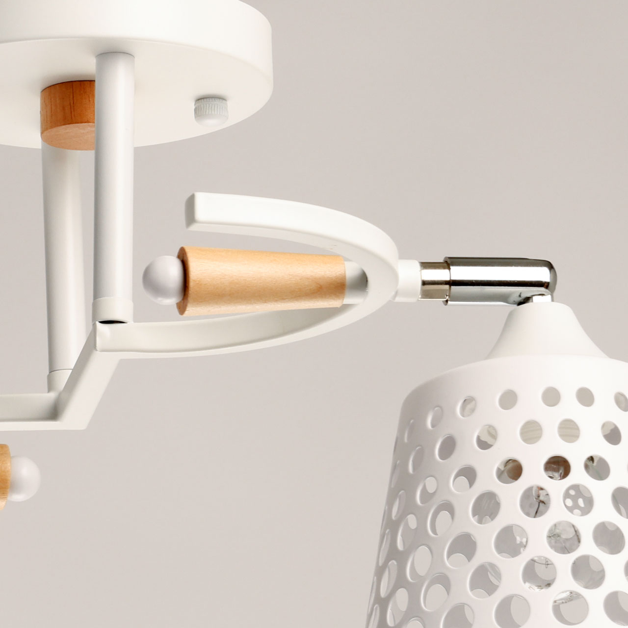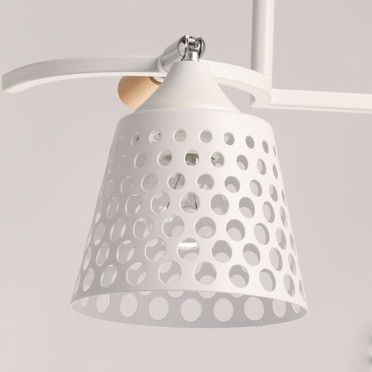 Металлическое основание потолочной люстры окрашено в белый цвет. Отдельные элементы основания гальванизированы в цвет хрома. Металлические плафоны перфорированы и окрашены в цвет основания. Светильник декорирован элементами из светлого натурального дерева.
