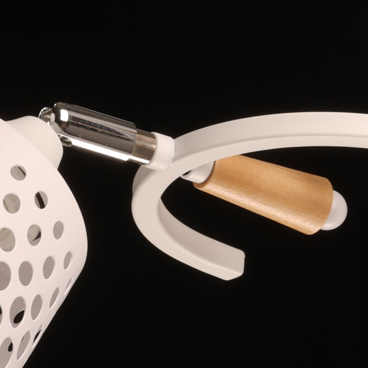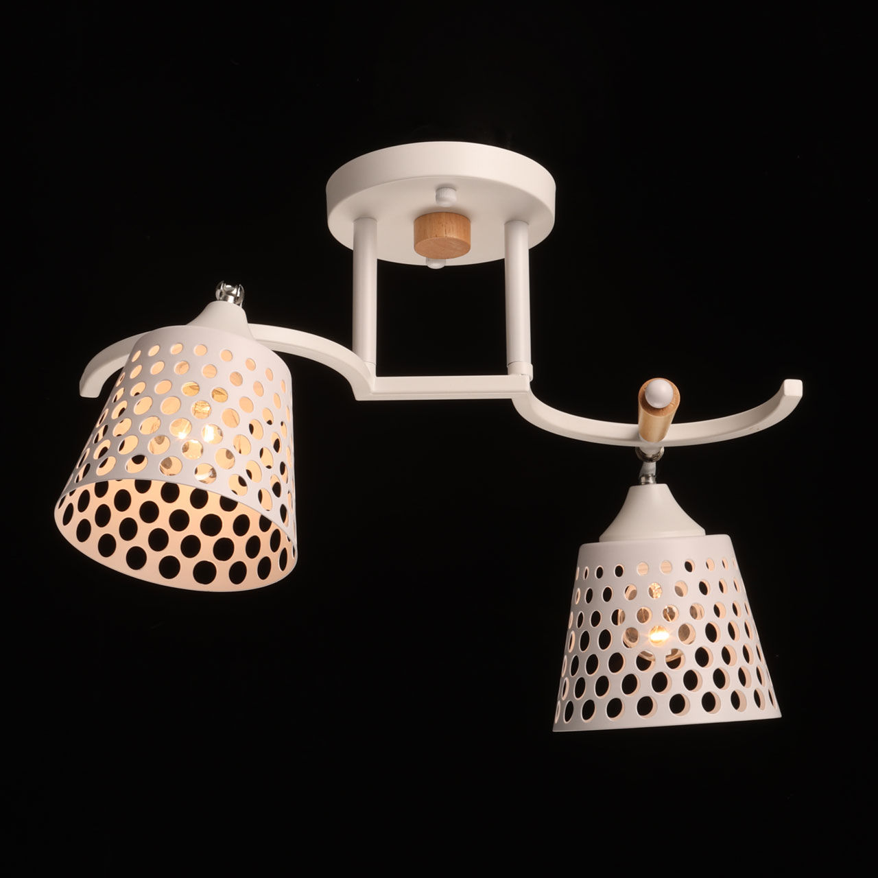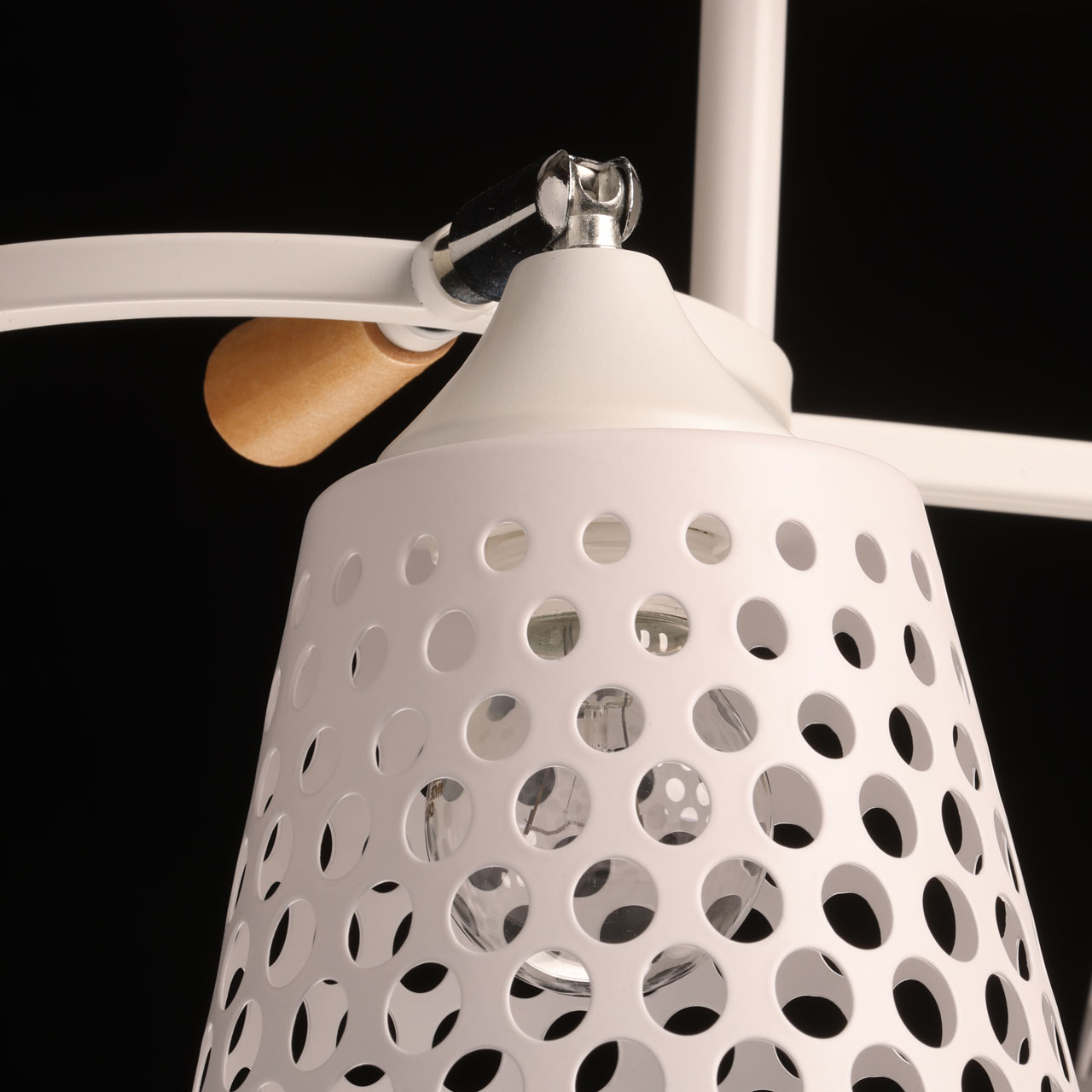 Металлическое основание потолочной люстры окрашено в белый цвет. Отдельные элементы основания гальванизированы в цвет хрома. Металлические плафоны перфорированы и окрашены в цвет основания. Светильник декорирован элементами из светлого натурального дерева.
