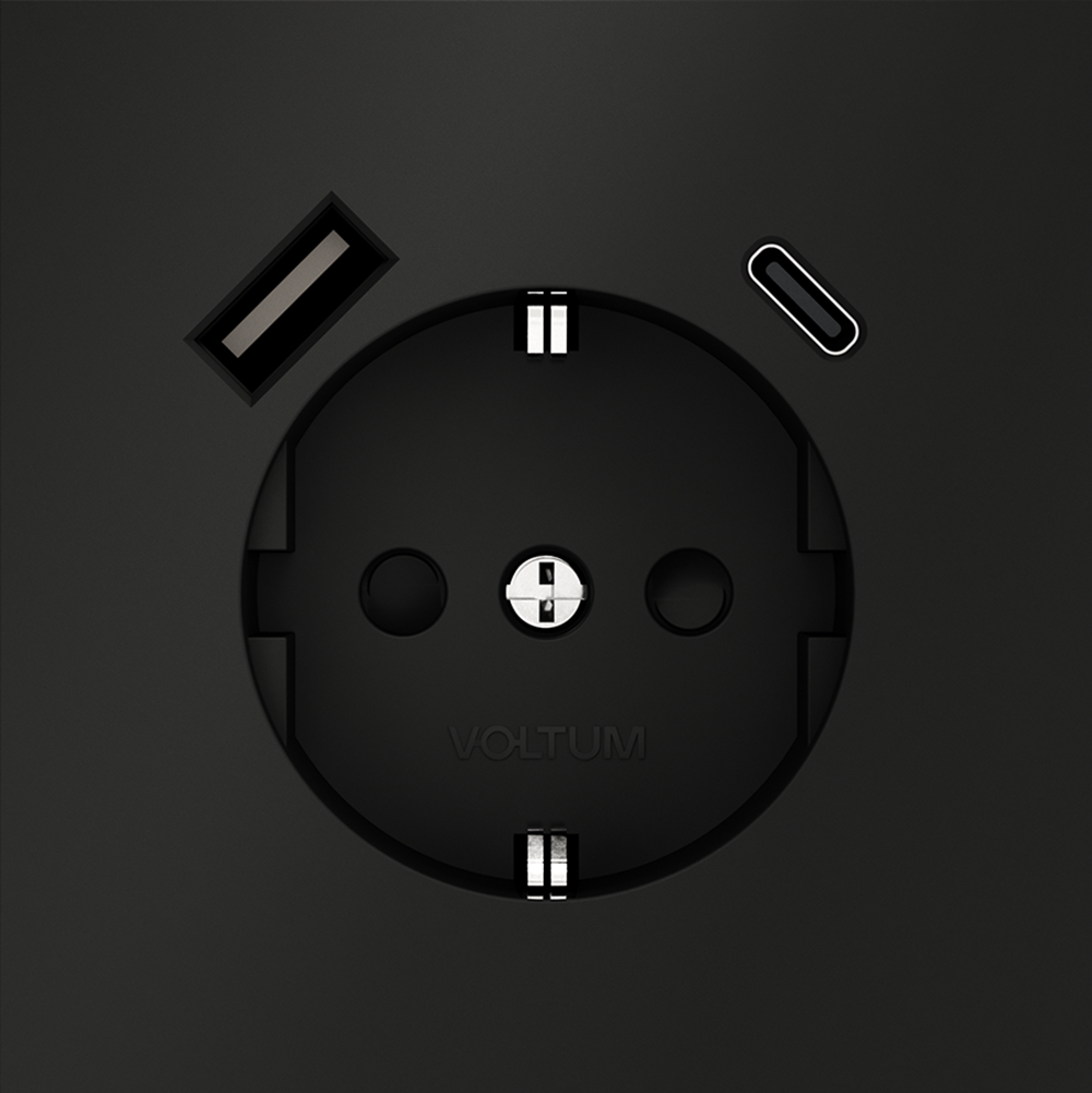 Купить "Розетка встраиваемая с заземлением и защитными шторками, 16А, с USB, A+С Voltum S70 VLS040508 (черный матовый"
