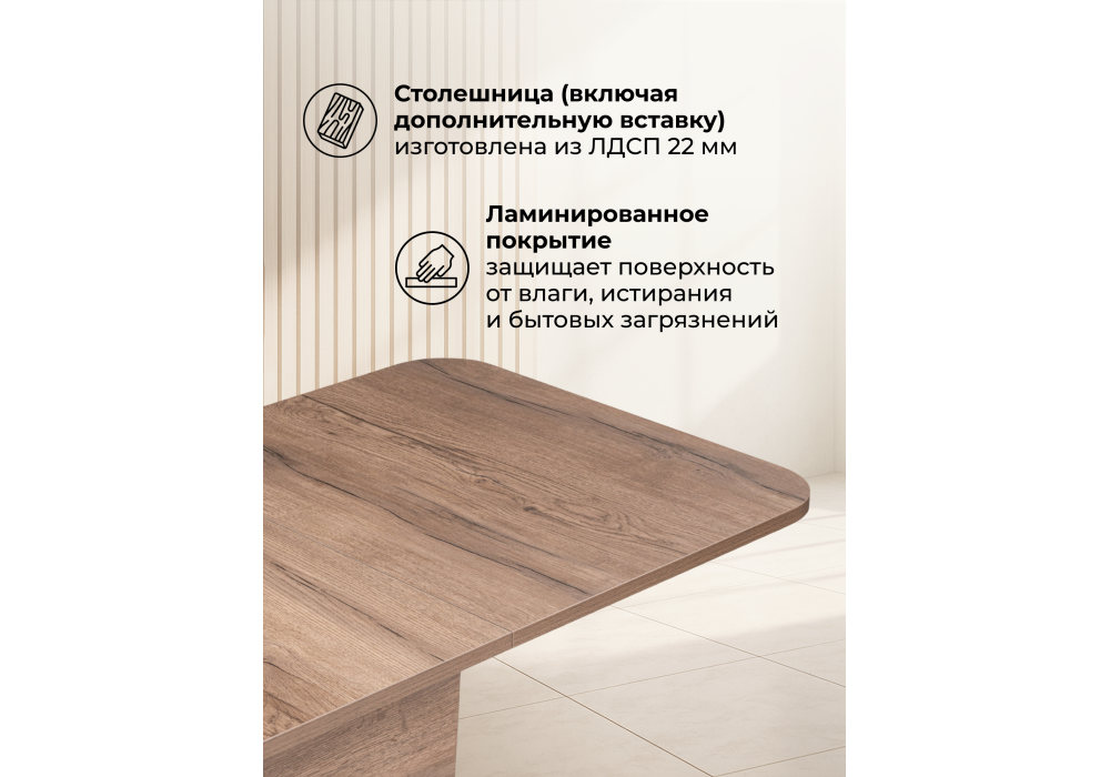 Толщина столешницы: 2,2 см. Материал каркаса - ЛДСП; Ширина - 75; Высота - 76; Длина стола в разложенном виде - 152; Длина - 120;