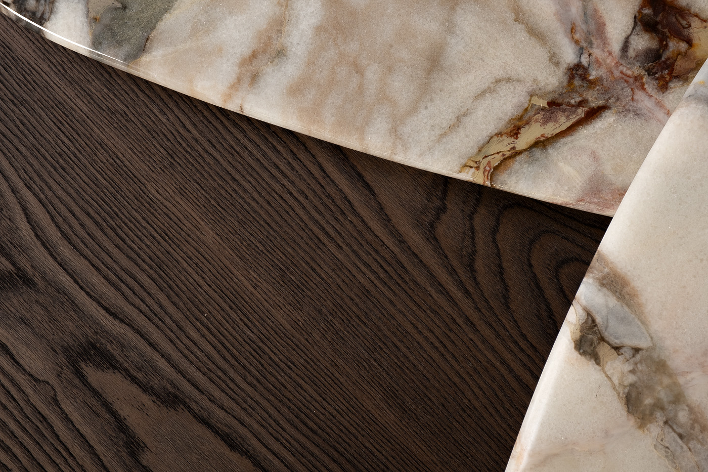 Необычный журнальный стол с тремя столешницами станет изысканным украшением современной гостиной или холла. Две столешницы выполнены из натурального мрамора светлого оттенка с красивым природным рисунком. Третья столешница, расположенная на нижнем уровне, изготовлена из МДФ, отделанного темным шпоном. Такое сочетание материалов и фактур выглядит очень эффектно и подчеркивает уникальность авторского дизайна.Столешница вырезана из натурального мрамора! Рисунок и цвет каждой столешницы индивидуален, неповторим и уникален!
