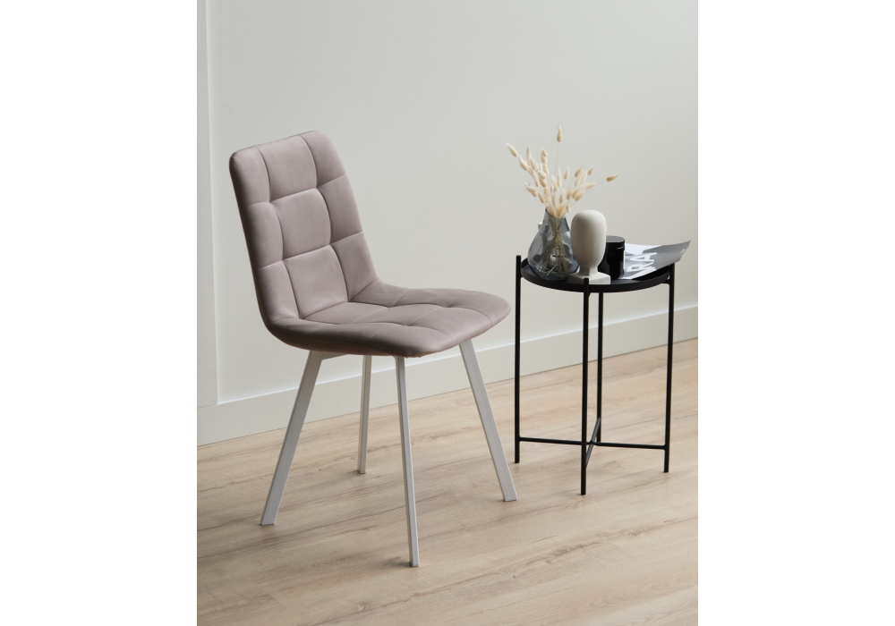 Материал каркаса - металл; Материал сиденья - велюр; Материал обивки - велюр; Цвет ножек - белый; Ширина - 43,5; Глубина - 50; Высота - 87,5; Ширина сиденья - 40; Глубина сиденья - 37,5; Высота сиденья - 49;