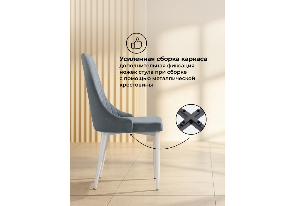 Материал каркаса - металл; Материал сиденья - велюр; Материал обивки - велюр; Цвет ножек - белый; Ширина - 47; Глубина - 57; Высота - 89; Ширина сиденья - 44; Глубина сиденья - 44; Высота сиденья - 47;