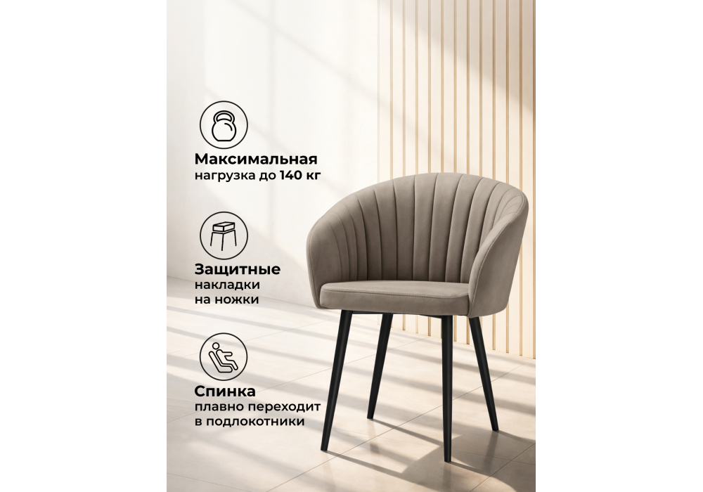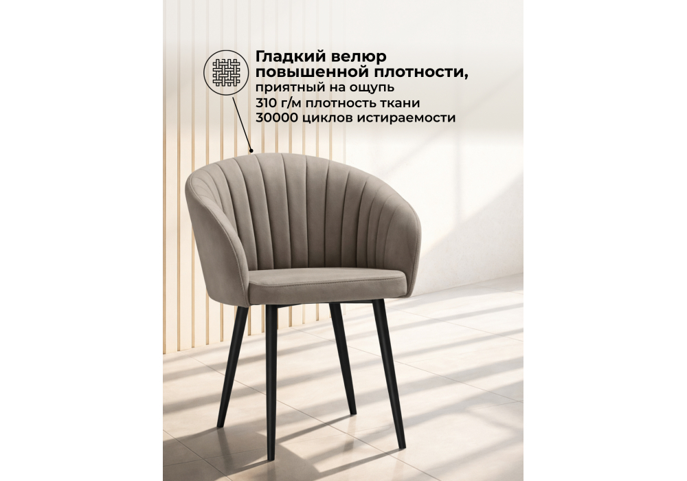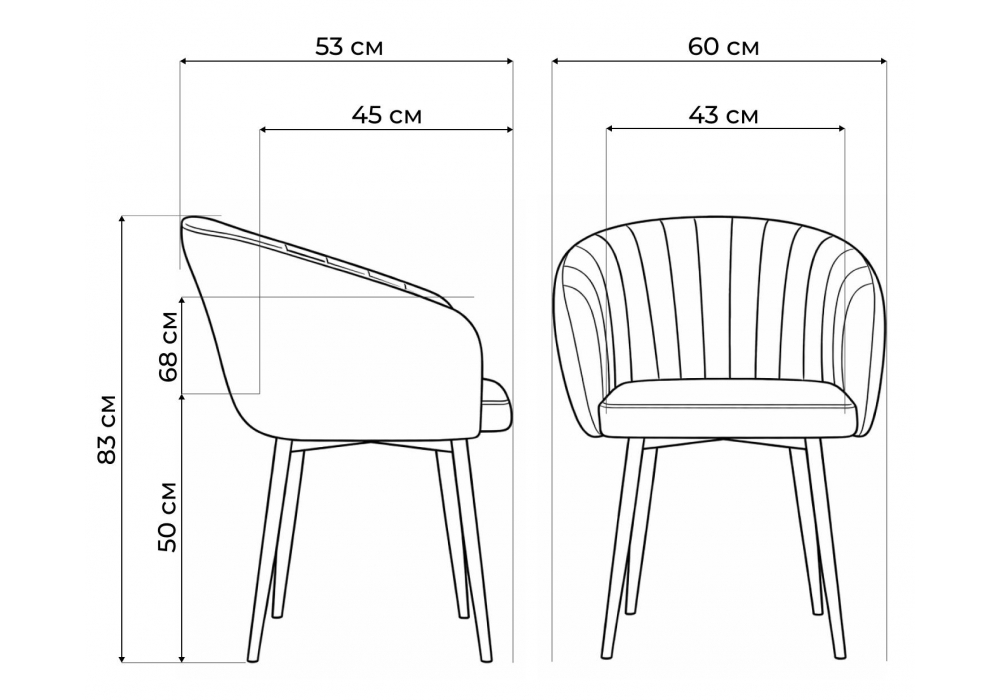 Материал каркаса - металл; Материал сиденья - велюр; Материал обивки - велюр; Цвет ножек - черный; Ширина - 60; Глубина - 53; Высота - 83; Ширина сиденья - 43; Глубина сиденья - 45; Высота сиденья - 50;