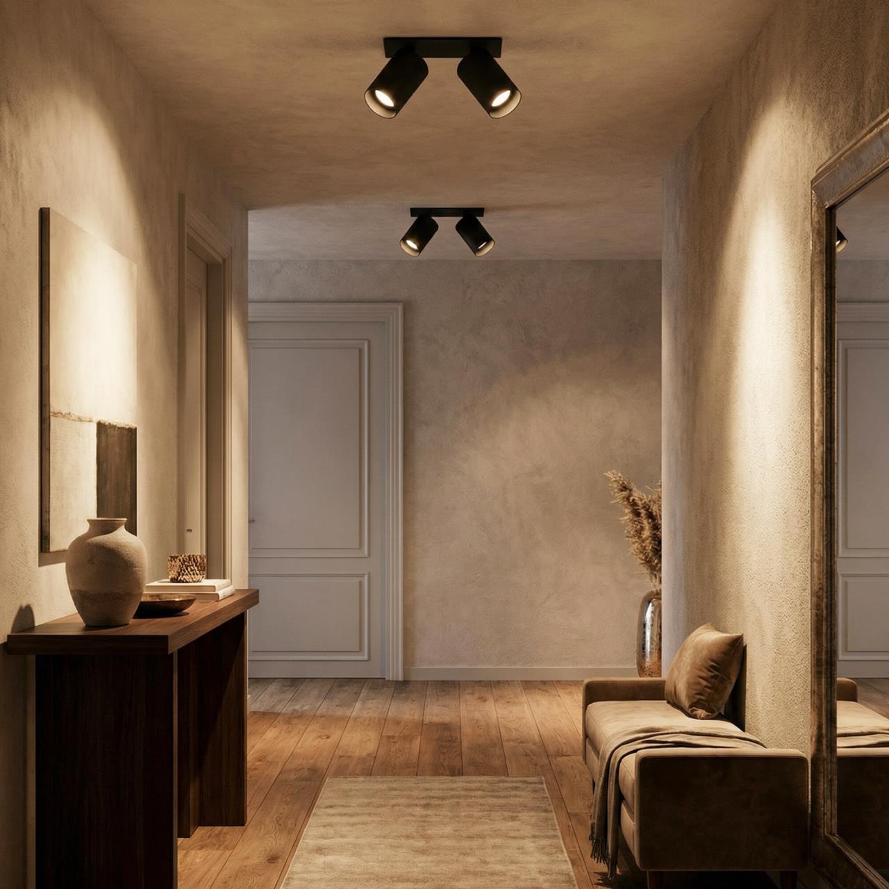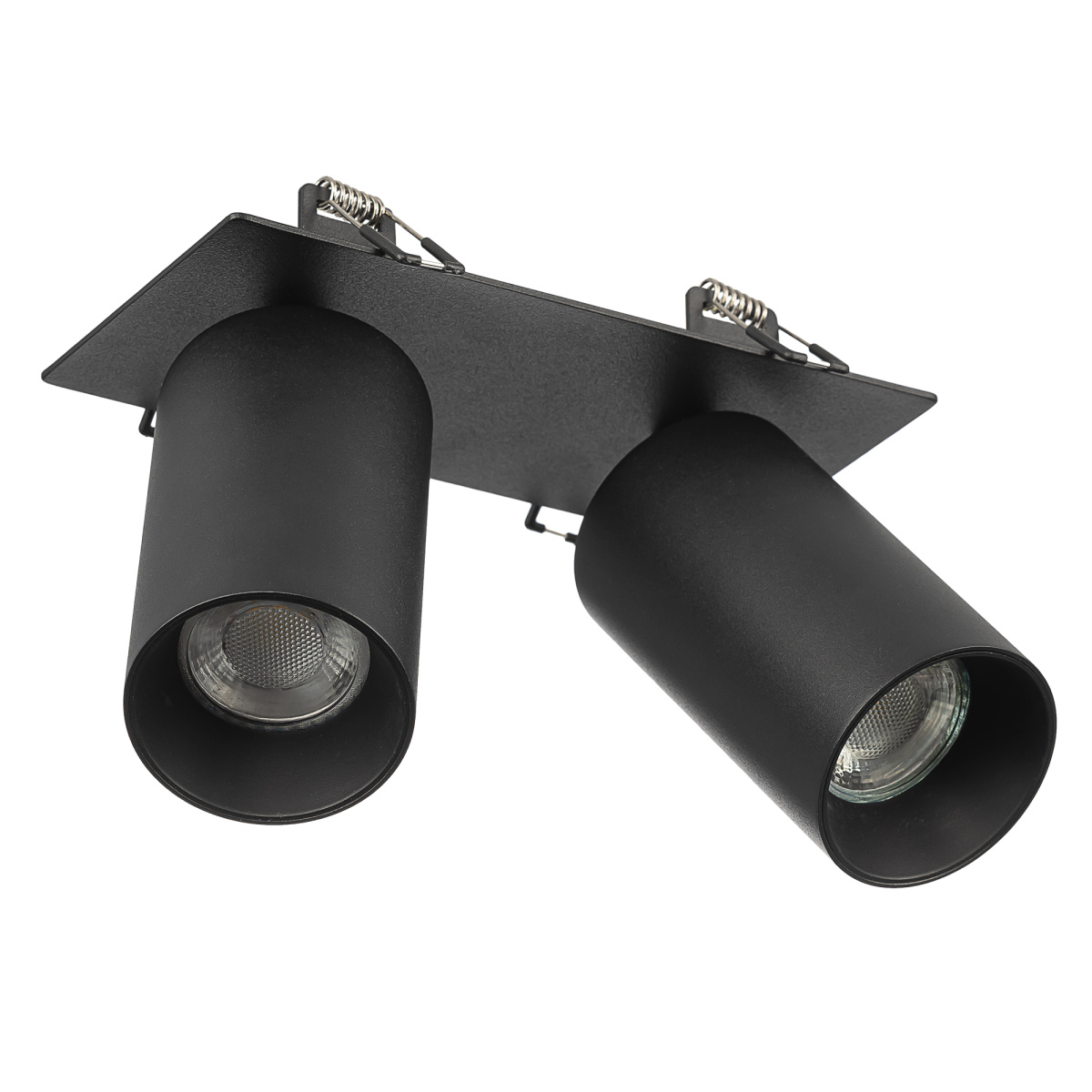 Корпус модели металлический, стильного черного оттенка. Плафоны цилиндрической формы имеют поворотное крепление, позволяющее менять направление светового луча. Источником света служат две светодиодные лампочки с цоколем GU10 мощностью не более 10Вт, встраиваемый тип крепления. Плафоны вращаются независимо друг от друга, что дает возможность формировать разный рисунок света.